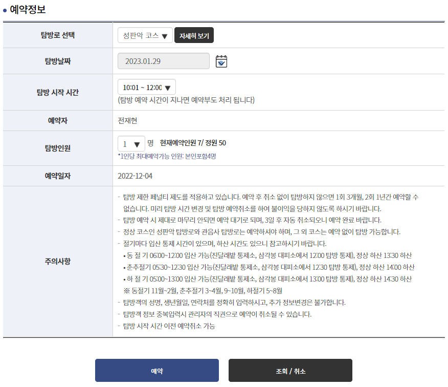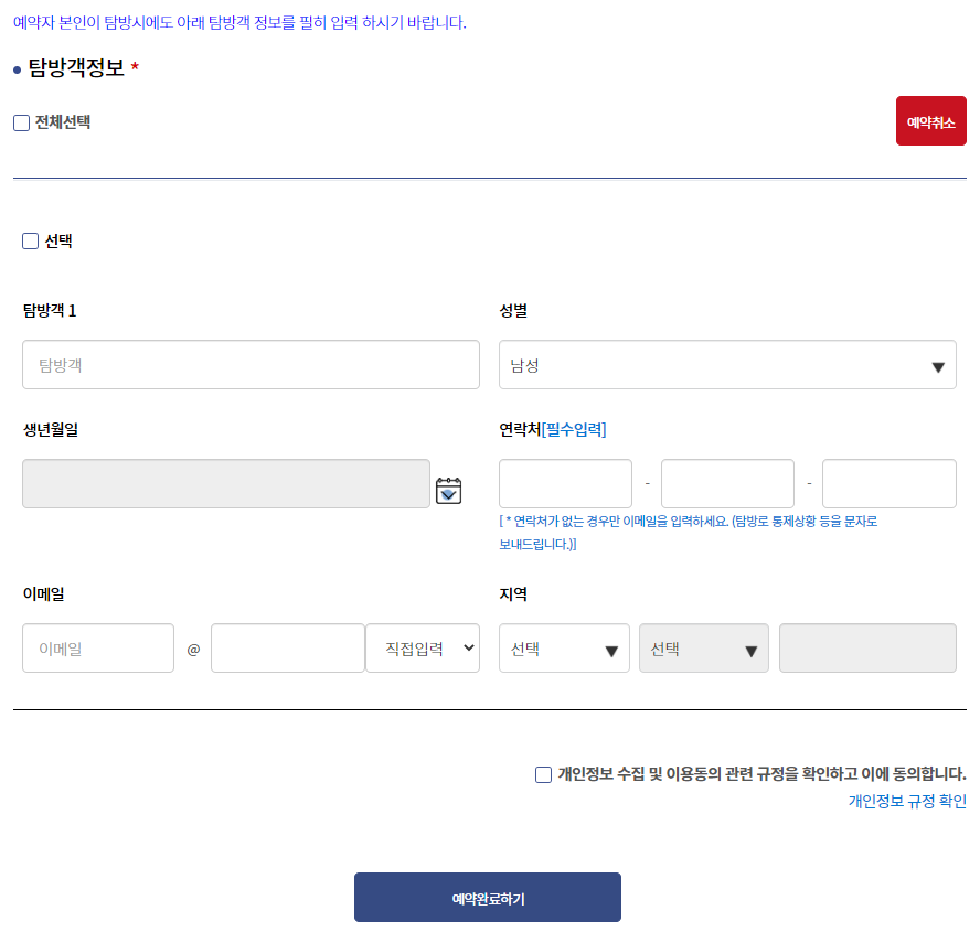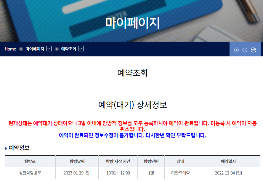 - 3일 후 자동 취소가 되며, 탐방 예약시 탐방객 정보까지 모두 입력해주셔야 합니다.