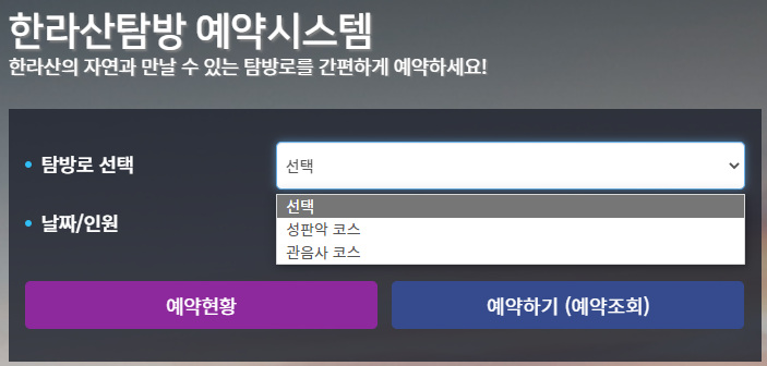 한라산 탐방로 선택은 성판악 코스와 관음사 코스 2가지가 있으며, 2가지 중 하나를 선택하셔서 예약 및 예약 현황을 확인 하실 수 있습니다.