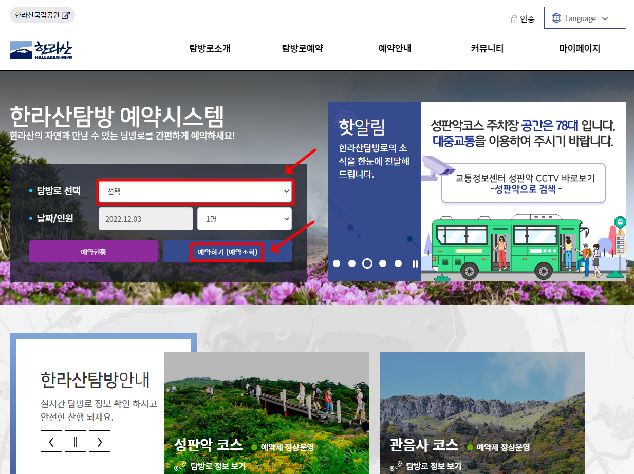 - 정상 코스 성판악, 관음사 코스는 예약하셔야 하며, 그 외 한라산 코스는 예약 없이 탐방이 가능합니다.