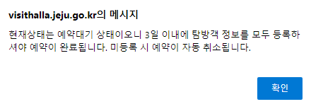 예약 버튼을 누르셨다면 메시지 창이 나오며, 현재상태는 예약대기 상태이오니 3일 이내에 탐방객 정보를 모두 등록하셔야 예약이 완료된다고 나옵니다. 만약 미등록 시 예약이 자동 취소가 되니 참고하시길 바랍니다.