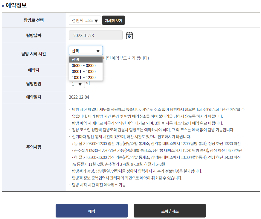 본인이 원하는 탐방로(성판악, 관음사)를 선택하시고, 탐방 날짜 체크하시고, 탐방 시작 시간은 3가지로 나뉘며, 오전 06:00시부터 08:00시, 08:01부터 10:00시, 10:01부터 12:00시 3가지가 있습니다.