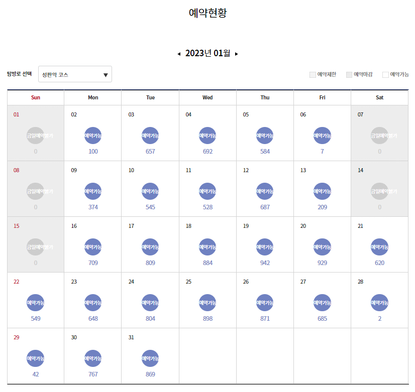 한라산 탐방 예약 사이트 첫 화면으로 되돌아가 주신 다음 '예약현황' 버튼을 클릭하셔서 성판악 코스와 관음사 코스 예약 가능한지 금일 예약불가한지 알아보실 수 있습니다.