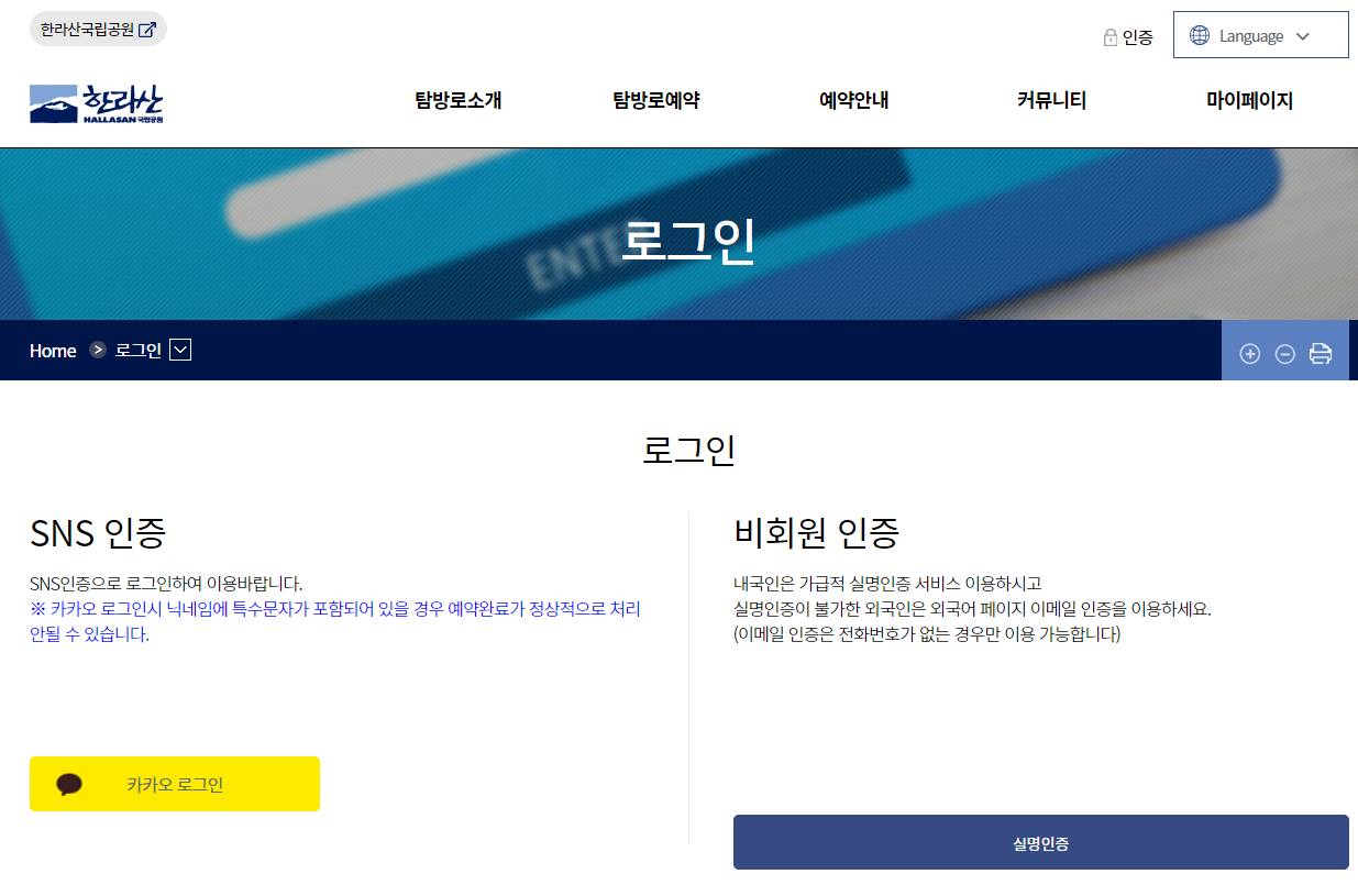 한라산 탐방 예약 시스템에서 탐방로 선택을 하고 날짜와 인원을 설정하신 다음 '예약하기(예약조회)' 버튼을 클릭하셨다면 로그인 창이 나오며, SNS 인증 및 비회원 인증으로 로그인을 하실 수 있습니다.