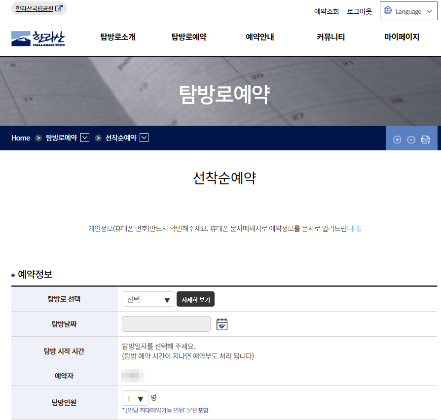 로그인을 하셨다면 '한라산 탐방로예약 > 선착순예약' 창이 나오며, 탐방로 선택 및 날짜, 시작 시간, 예약자, 인원, 일자, 주의사항 선택하실 수 있습니다.