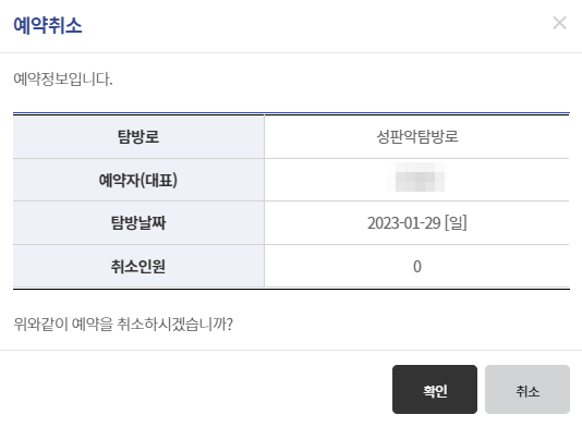 예약 취소버튼을 클릭하시면 예약 취소 창이 나오며, 예약 정보를 확인하시고 '확인' 버튼을 클릭하셔서 예약 취소를 하시면 됩니다.