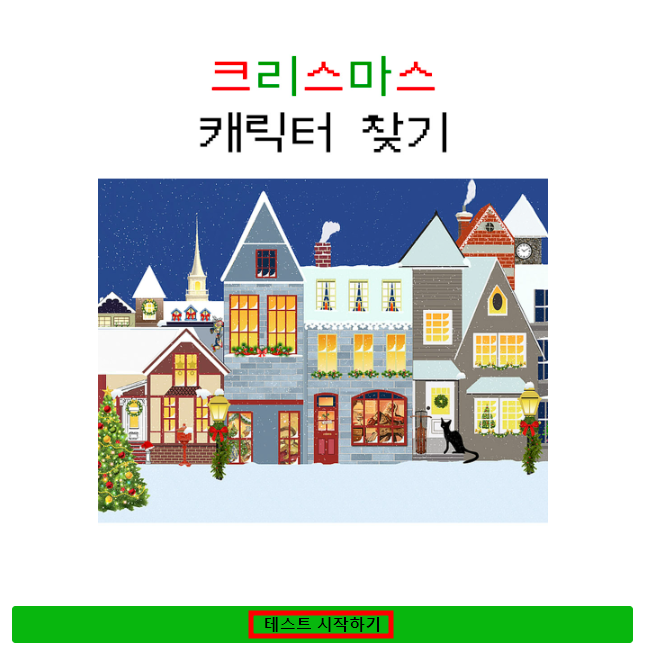 크리스마스 캐릭터 찾기 테스트 사이트에 들어가주셔서 '테스트 시작하기' 버튼을 클릭하셔서 테스트를 시작해보겠습니다.
