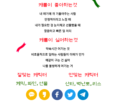 캐롤과 잘 맞는 캐릭터는 케익, 와인, 선물이며, 캐롤과 잘 안 맞는 캐릭터는 산타, 벽난로, 리스입니다.