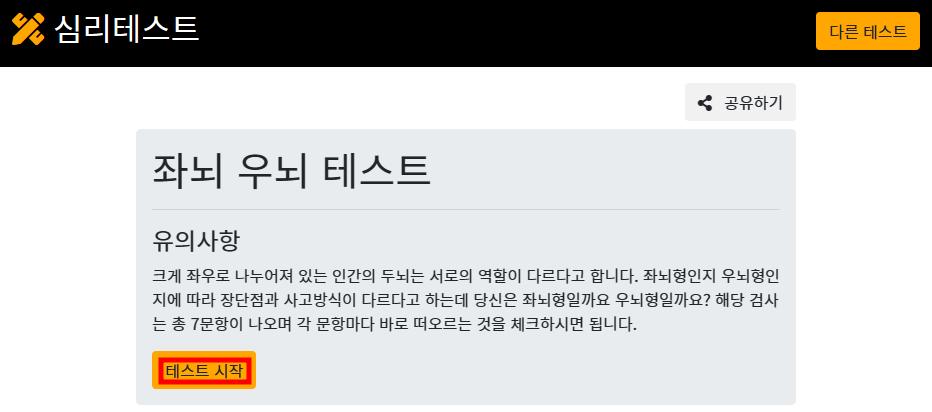 좌뇌 우뇌 테스트 사이트에 들어가셨다면 '테스트 시작' 버튼을 클릭하시면 됩니다.