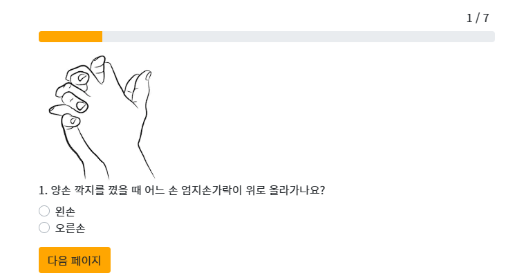 1. 양손 깍지를 꼈을 때 어느 손 엄지 손가락이 위로 올라가나요? '왼손 or 오른손'