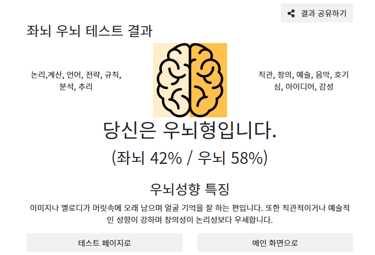 테스트를 통해서 자뇌 성향과 우뇌 성향의 특징들에 대해서 알아보았습니다. 좌뇌 우뇌 테스트 결과를 공유하실 수 있으며, 테스트 페이지로 또는 메인 화면으로 다시 돌아가실 수 있습니다.