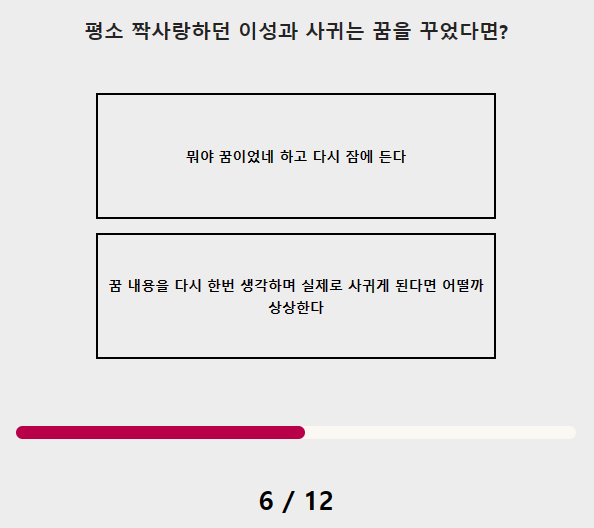 5. 연인과 길을 걷다가 대기 줄이 어마어마한 식당을 발견했다면? 6. 평소 짝사랑하던 이성과 사귀는 꿈을 꾸었다면?