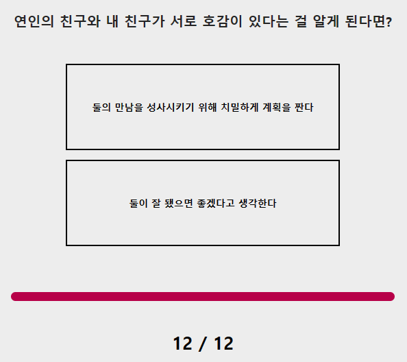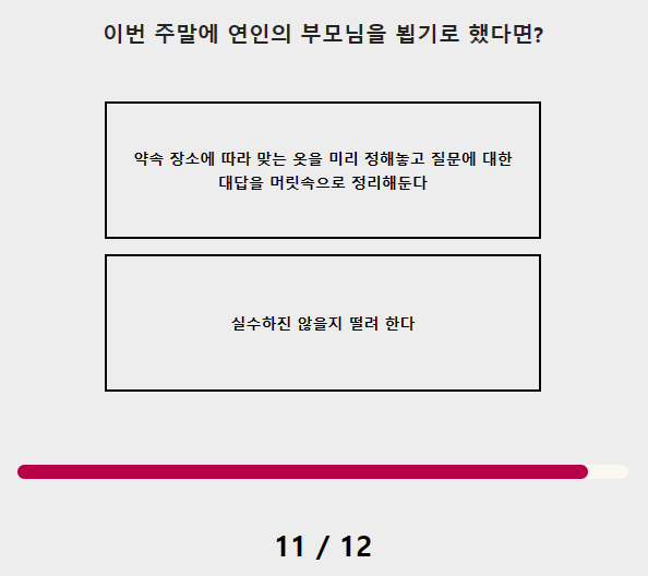 11. 이번 주말에 연인의 부모님을 뵙기로 했다면? 12. 연인의 친구와 내 친구가 서로 호감이 있다는 걸 알게 된다면?