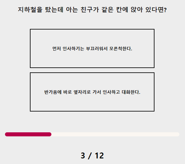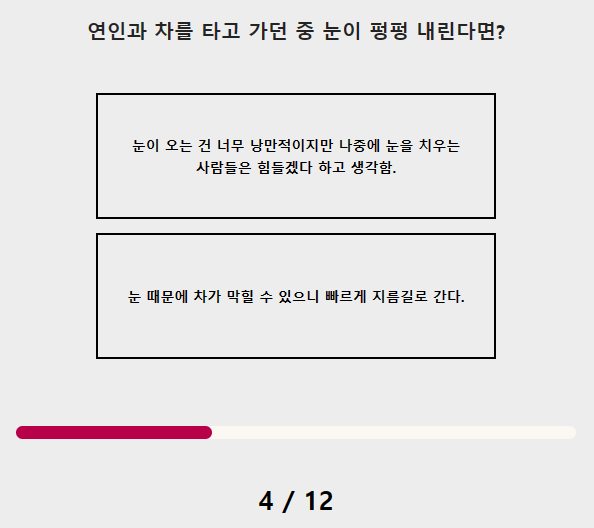 3. 지하철을 탔는데 아는 친구가 같은 칸에 앉아 있다면? 4. 연인과 차를 타고 가던 중 눈이 펑펑 내린다면?