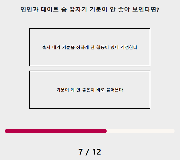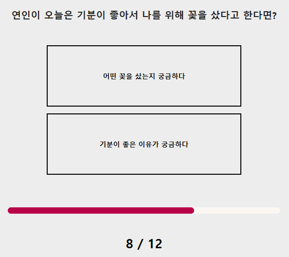 7. 연인과 데이트 중 갑자기 기분이 안 좋아 보인다면? 8. 연인이 오늘은 기분이 좋아서 나를 위해 꽃을 샀다고 한다면?