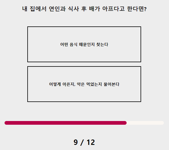9. 내 집에서 연인과 식사 후 배가 아프다고 한다면? 10. 오랜만에 친구들과 주말에 여행을 가기로 한다면?