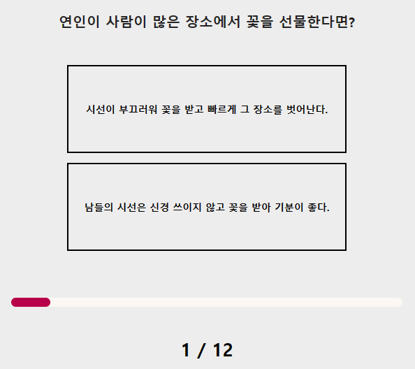사랑의 안개꽃 테스트 문항 수는 총 12가지이며, 소요시간은 약 2분에서 3분 정도 걸립니다.