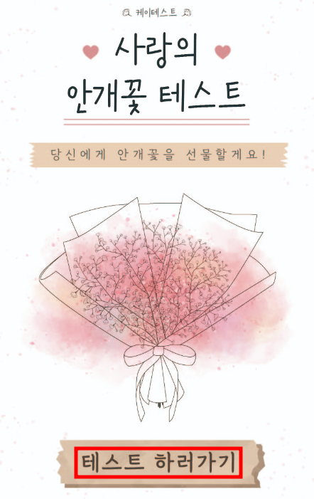 사랑의 안개꽃 테스트 사이트에 들어가주셔서 '테스트 하러가기' 버튼을 클릭하여 시작하실 수 있습니다.