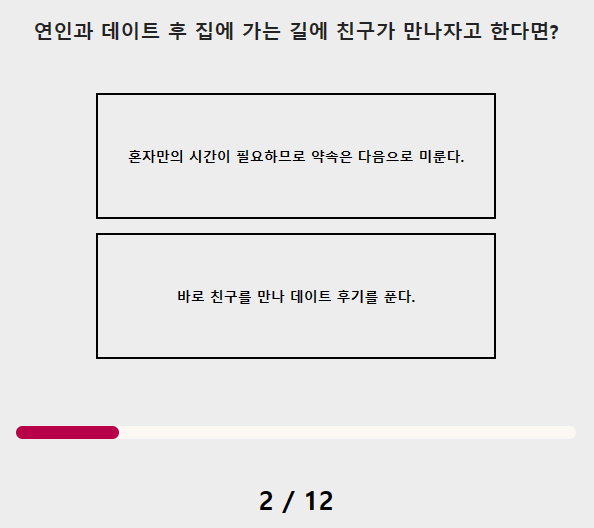 1. 연인이 사람이 많은 장소에서 꽃을 선물한다면? 2. 연인과 데이트 후 집에 가는 길에 친구가 만나자고 한다면?