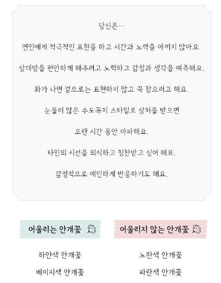 위와 같이 사랑의 안개꽃 테스트 결과와 자신의 MBTI 유형을 비교하여 확인해보실 수 있습니다.
