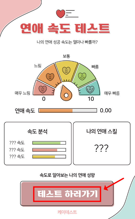 연애 속도 테스트 링크는 아래의 내용을 참고해주시고, 케이테스트 홈페이지에는 다른 재미있는 테스트들이 많이 있어서 참고하시면 됩니다.