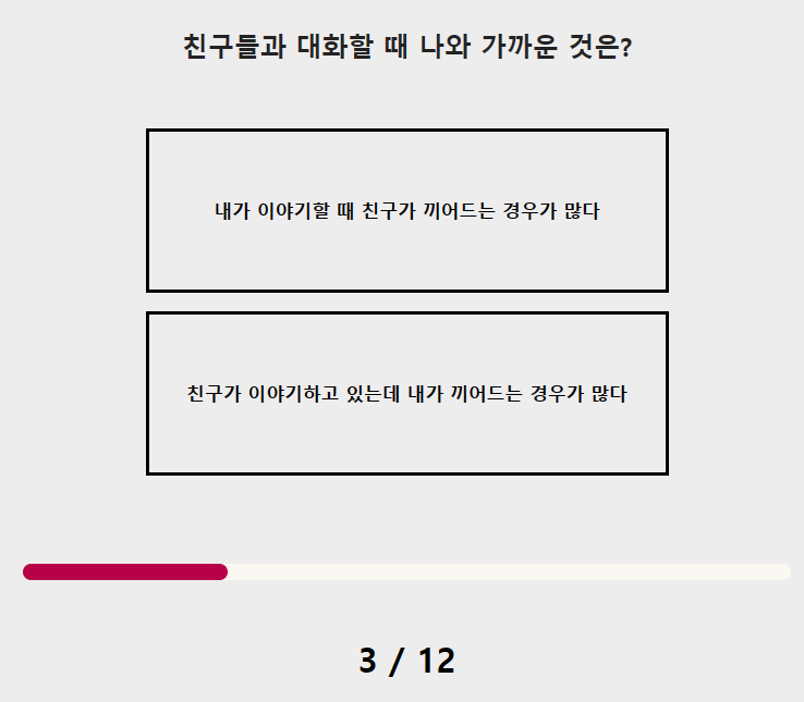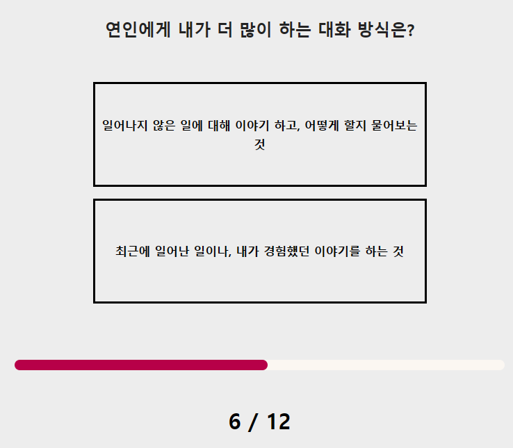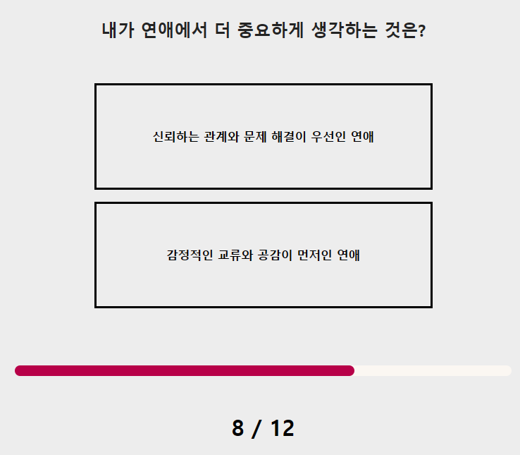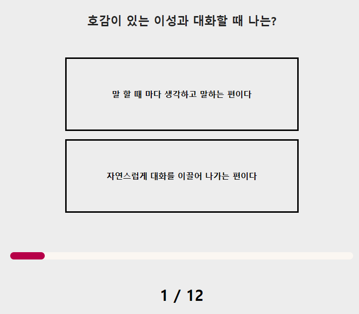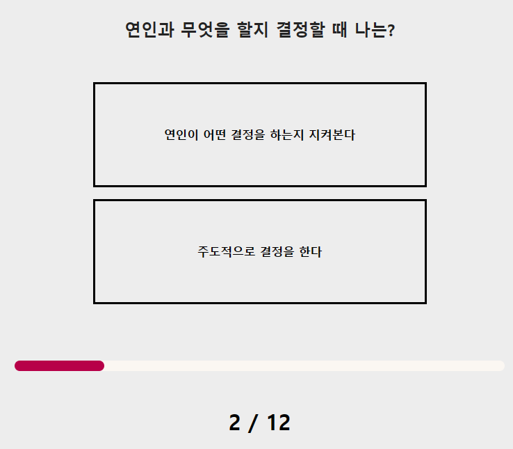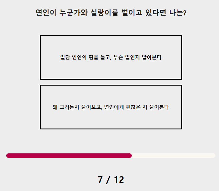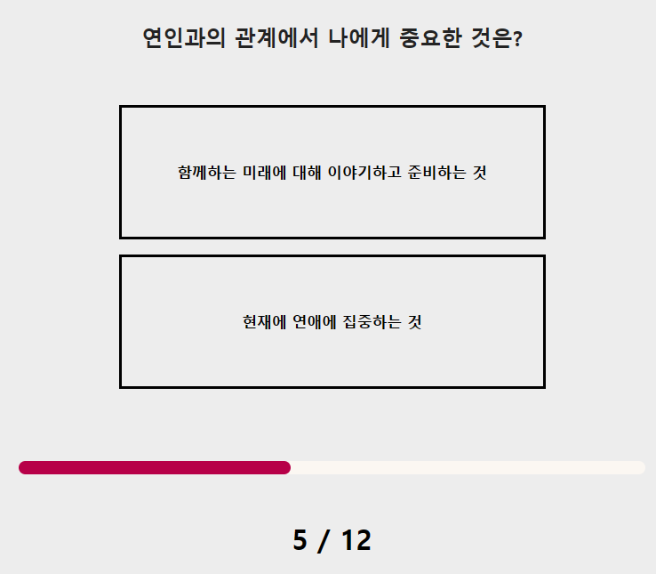 연애 속도 테스트 질문(문항) 수는 총 12가지이며, 테스트 소요 시간은 약 2분에서 3분 정도 걸립니다.