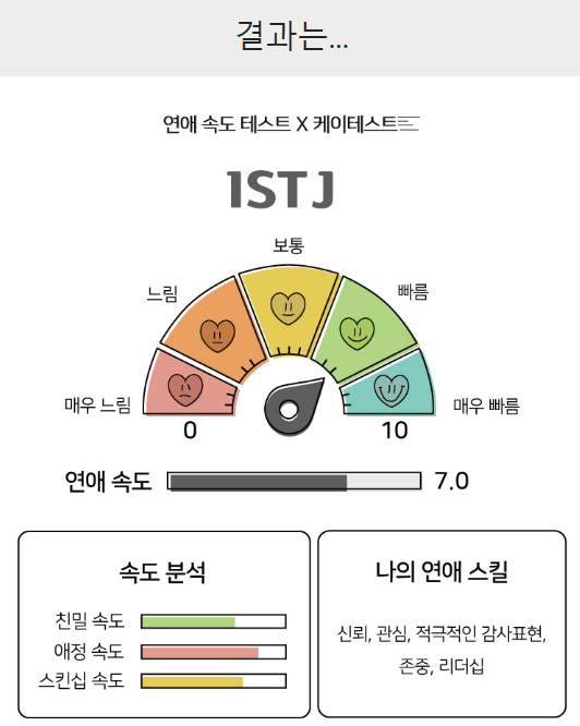 연애 속도 테스트 결과는 'ISTJ' 연애 속도 7.0/10.0(빠름)이 나왔습니다. 나의 연애 스킬은 신뢰, 관심, 적극적인 감사표현, 존중, 리더십이 나왔습니다.