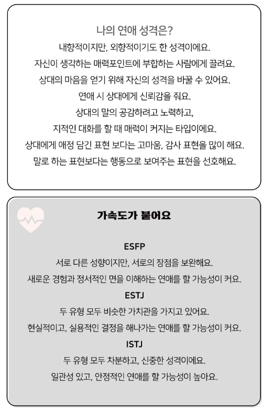 위와 같이 자신의 연애 속도 테스트 결과를 확인해 보실 수 있습니다. 테스트를 통해서 나의 연애 성향과 MBTI 유형을 알아볼 수 있어서 재미있었습니다.