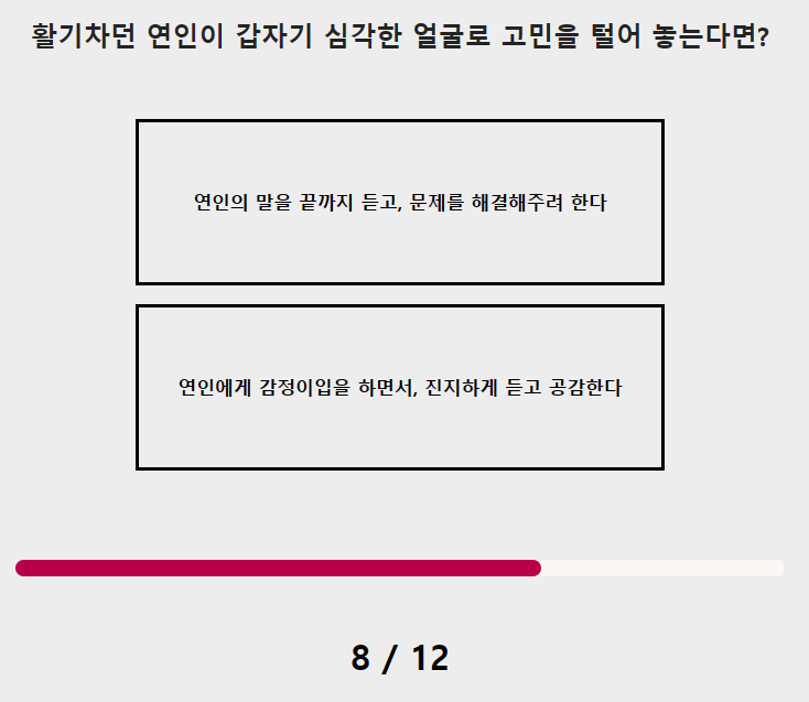 7. 연인과 갈등 상황에 나는? 8. 활기차던 연인이 갑자기 심각한 얼굴로 고민을 털어 놓는다면?