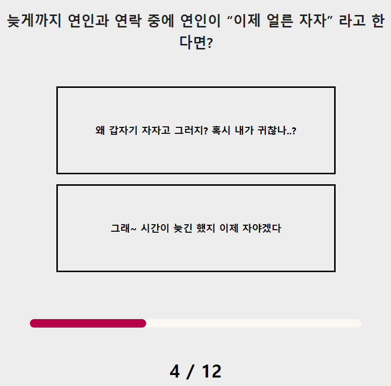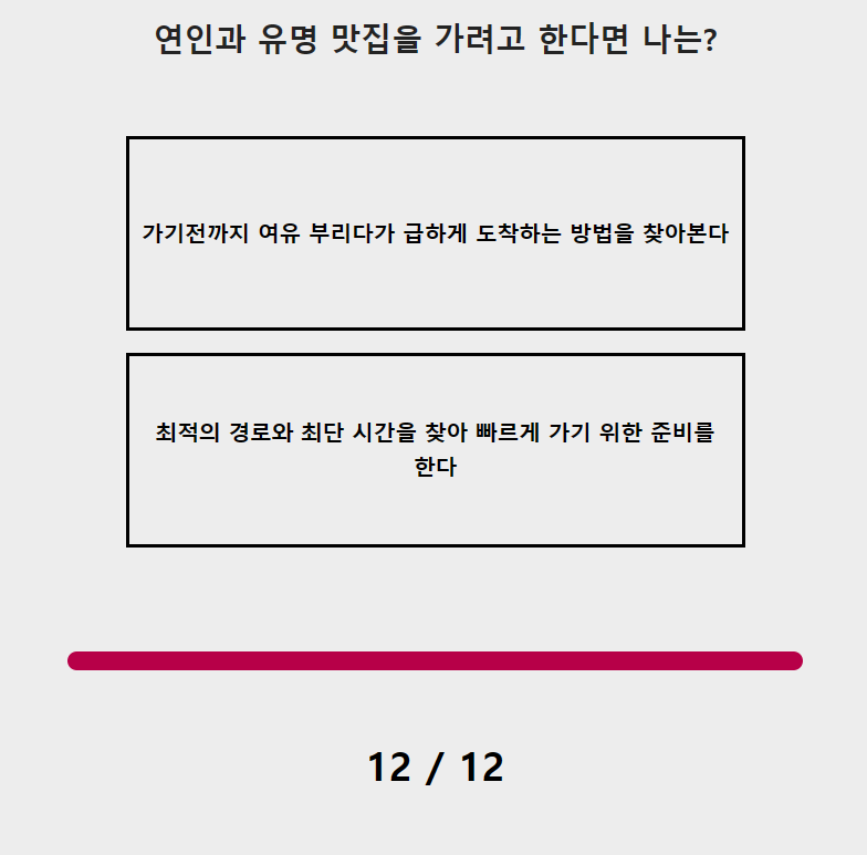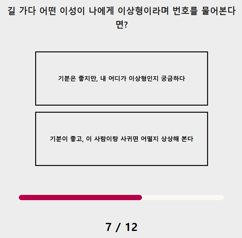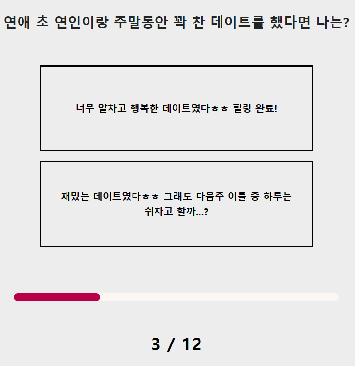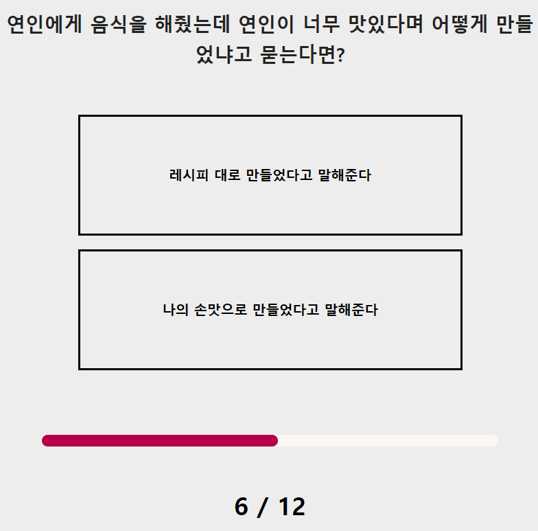 커플 캐릭터 테스트 문항 수는 총 12가지이며, 소요시간은 약 2분에서 3분 정도 걸립니다.