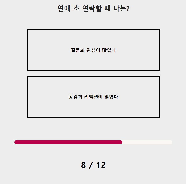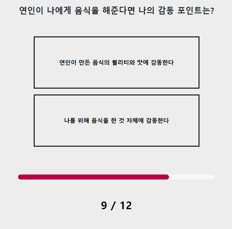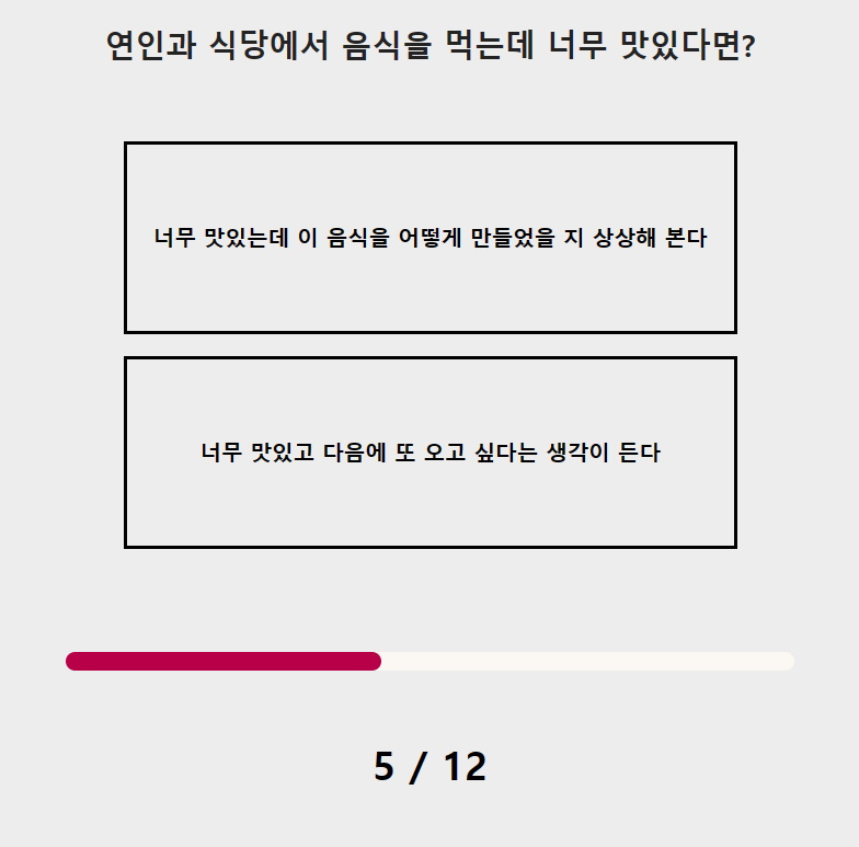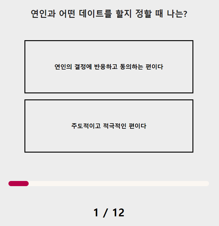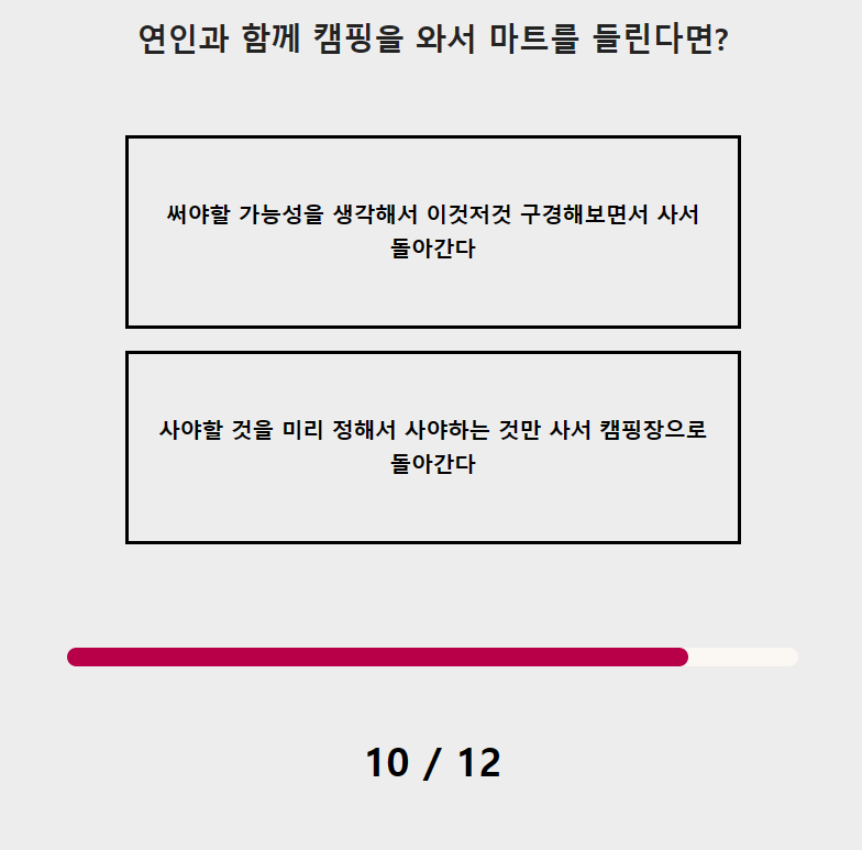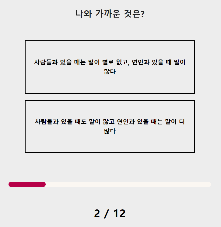 커플 캐릭터 테스트 문항 수는 총 12가지이며, 소요시간은 약 2분에서 3분 정도 걸립니다.