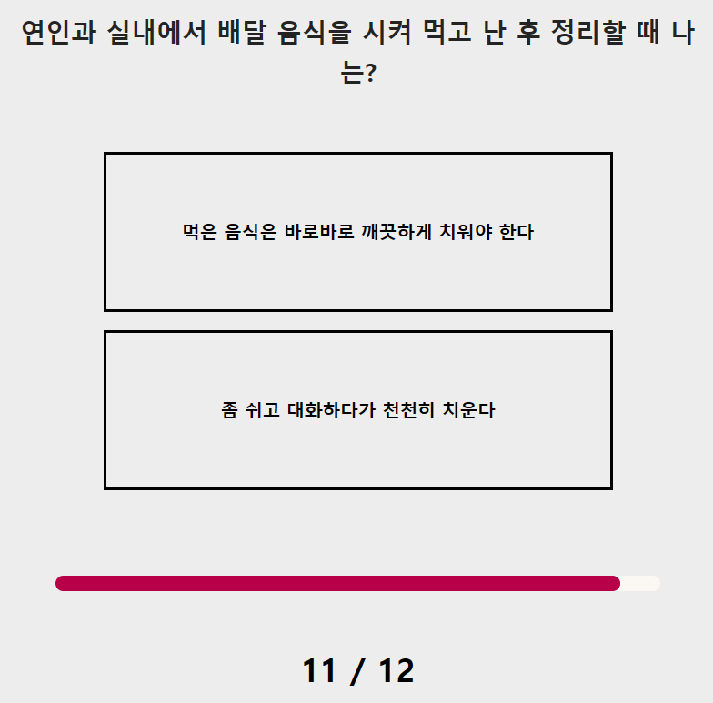 11. 연인과 실내에서 배달 음식을 시켜 먹고 난 후 정리할 때 나는? 12. 연인과 유명 맛집을 가려고 한다면 나는?