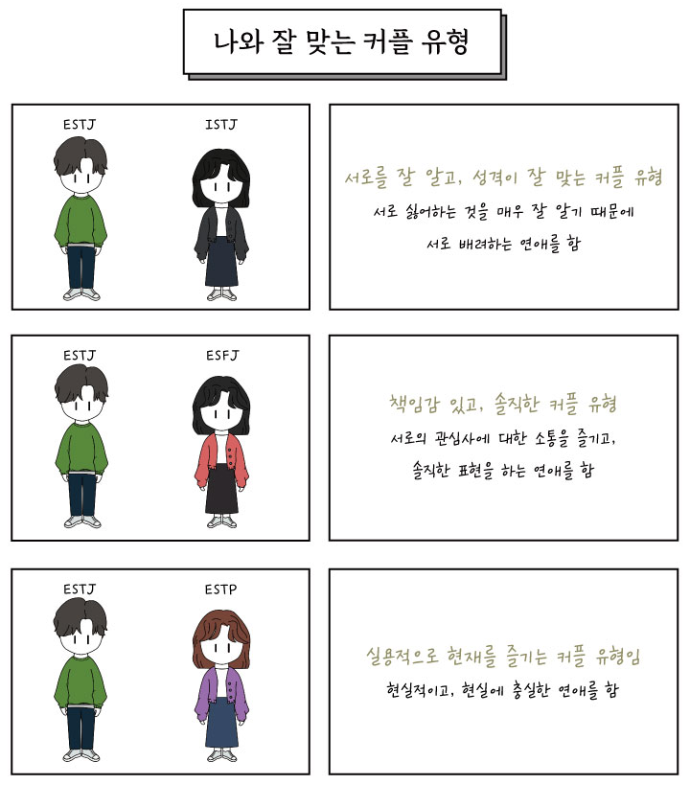 ESTJ와 잘 맞는 커플 유형(MBTI)는 3가지(ISTJ, ESFJ, ESTP)가 나왔으며, 나와 잘 맞는 커플 유형은 다음과 같습니다.