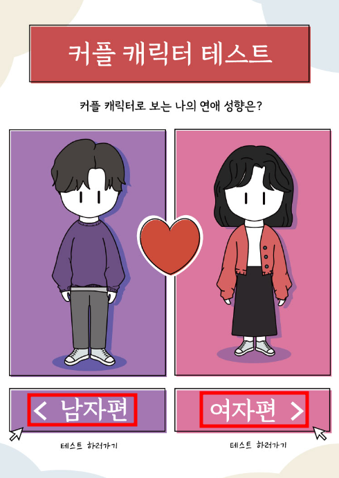 아래의 링크를 통해서 커플 캐릭터 테스트 사이트에 들어가주셔서 '남자편 및 여자편 테스트 하러가기' 버튼을 클릭해주시면 됩니다.