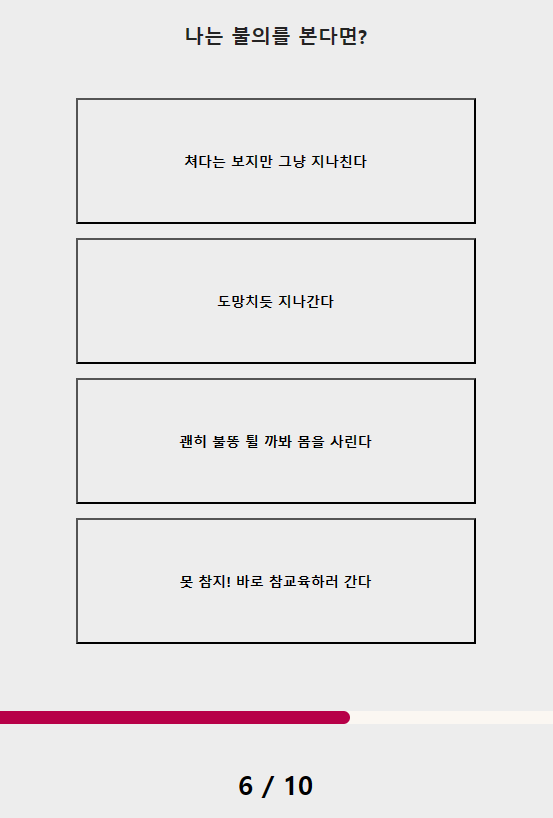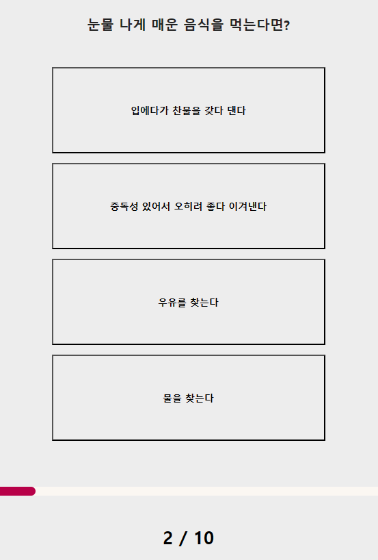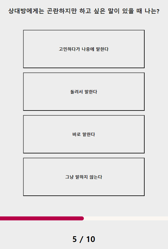 테스트는 간단한 형식으로 되어 있어 자신의 생각과 4가지 답안 중 하나를 선택하는 형식입니다.