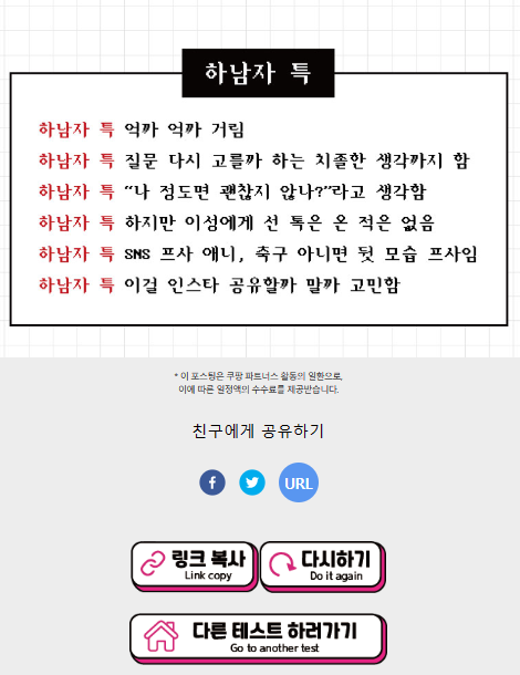 하남자 하여자 테스트 10문제를 다 체크하셨다면 결과를 알아볼수 있으며, 테스트 결과를 확인하시려면 쿠팡(광고) 사이트를 클릭하여 창이 나오며, 광고 창을 닫으신 후 '하남자 하여자 테스트' 결과를 알아볼 수 있습니다.