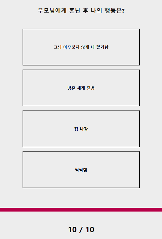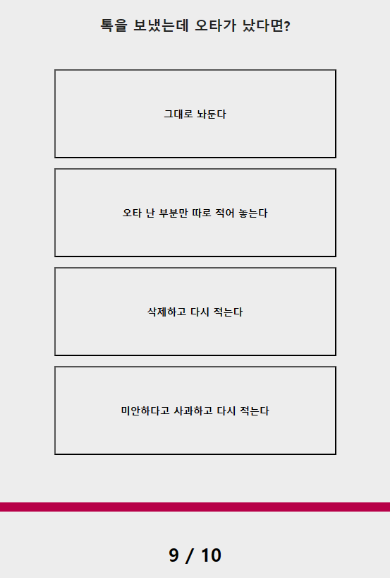 9. 톡을 보냈는데 오타가 났다면? 10. 부모님에게 혼난 후 나의 행동은?