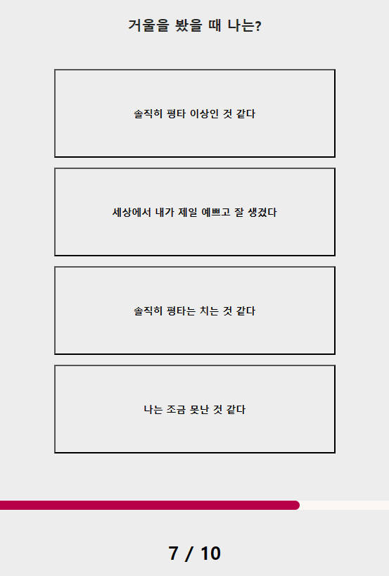 - 억까 억까 거림, 질문 다시 고를까 하는 치졸한 생각까지 함, "나 정도면 괜찮지 않나?'라고 생각함