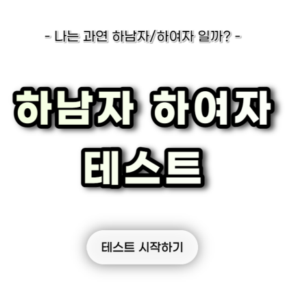 이처럼 하남자 하여자 테스트를 통해서 자신이 하남자/하여자 또는 상남자/상여자를 알아볼 수 있는 테스트가 궁금하시다면 아래의 링크나 버튼을 클릭하셔서 '하남자 하여자 테스트'를 실시해보시길 바랍니다.