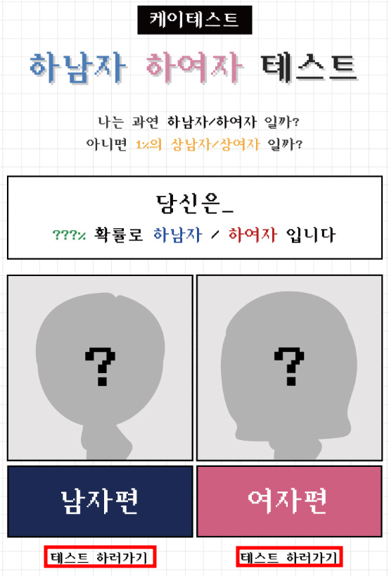 하남자 하여자 테스트 링크는 아래의 내용을 참고해주시고, 케이테스트 홈페이지에는 하남자 하여자 테스트 말고도 재미있는 테스트가 많이 있어 구경해보시길 바랍니다.