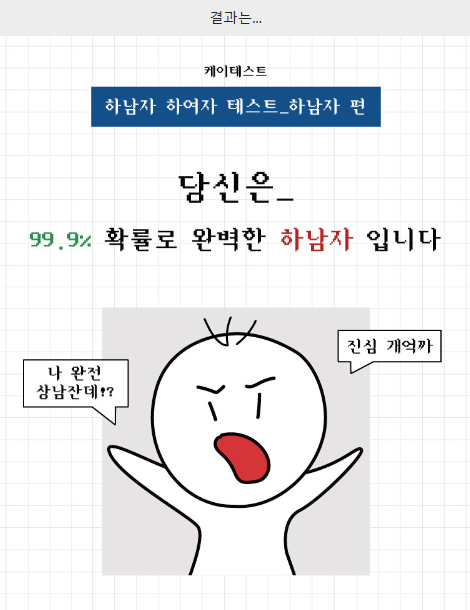 하남자 하여자 테스트 결과는 '99.9% 확률로 완벽한 하남자'가 나왔습니다.