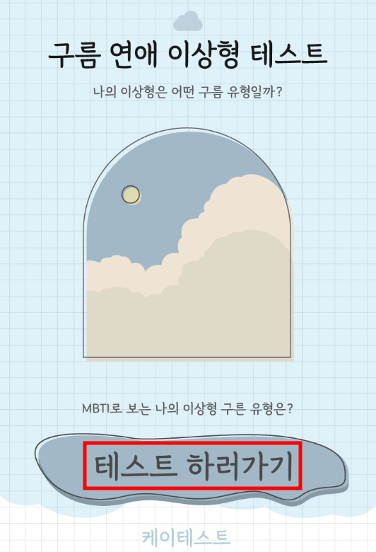 구름 연애 이상형 테스트는 나의 이상형은 어떤 구름 유형인지 어떤 MBTI 성격 유형이 나올지 알아보는 테스트입니다.