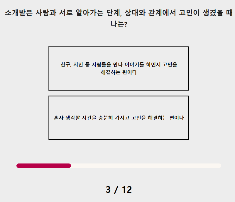 구름 연애 이상형 테스트 문항 수는 총 12가지이며, 소요시간은 약 2분에서 3분 정도 걸립니다.