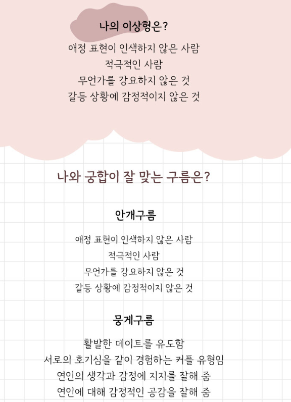 구름 연애 이상형 테스트 MBTI 유형별 결과는 다음과 같습니다.