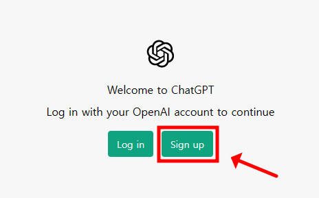 - 'Welcome to ChatGPT' 창이 나오며, 챗GPT를 처음 이용하시는 분들은 'Sign up' 버튼을 클릭하셔서 회원가입을 진행해주시면 됩니다. (기존의 아이디가 있으신 분들은 'Log in'을 클릭하시면 됩니다.)