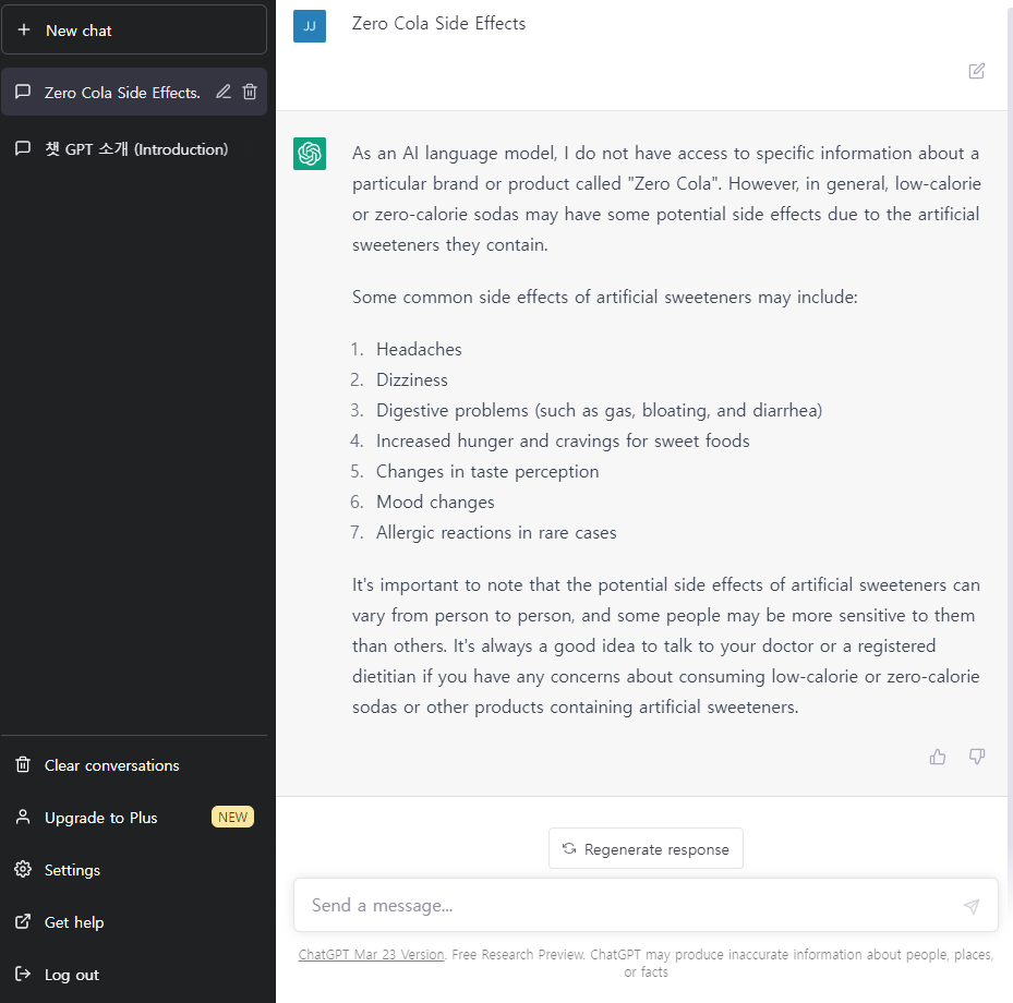 챗GPT 두 번째로 할 질문은 요즘 제로콜라가 인기가 많아 제가 즐겨 먹는 제로콜라의 부작용에 대해서 질문을 해보도록 하겠습니다.