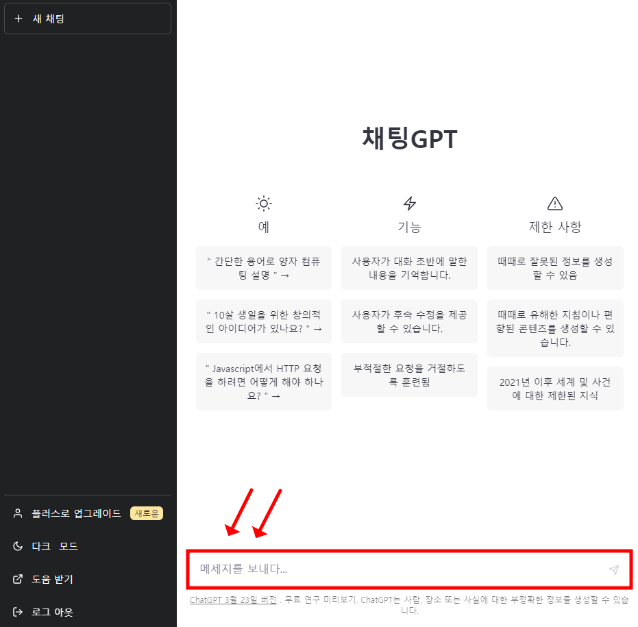 챗GPT의 사용 방법은 간단하며, 대화 상자 '메세지 보내기...' 칸에 질문 내용을 입력해 주시면 됩니다.