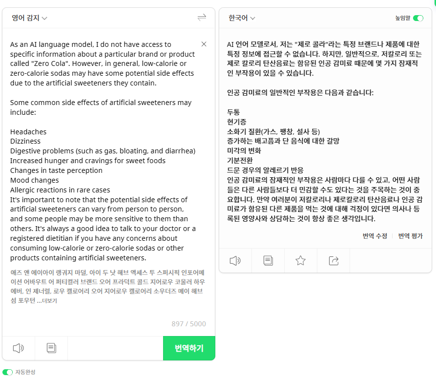 먼저 파파고나 구글 번역기를 통해서 영어로 번역을 해주어 'Zero Cola Side Effects(제로콜라 부작용)'을 질문을 해보았습니다.