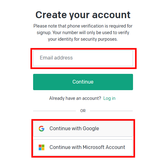 회원가입은 E-mail address(이메일 주소)를 입력하여 진행하실 수 있으며, 구글이나 마이크로소프트 아이디가 있으신 분들은 연동하셔서 챗GPT를 시작하셔도 됩니다.