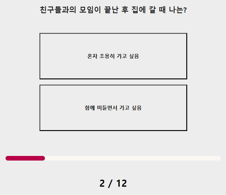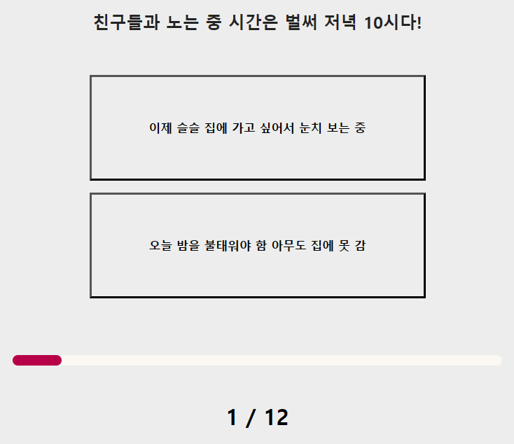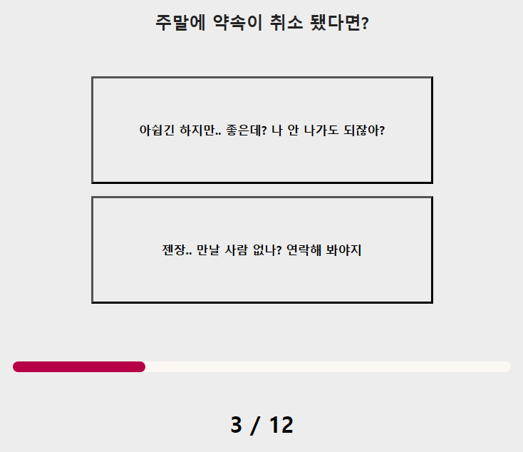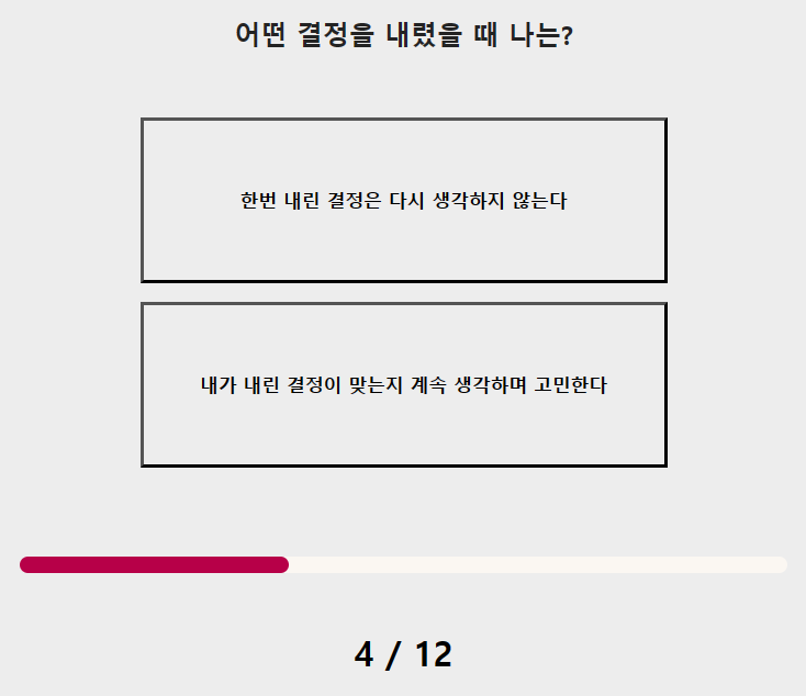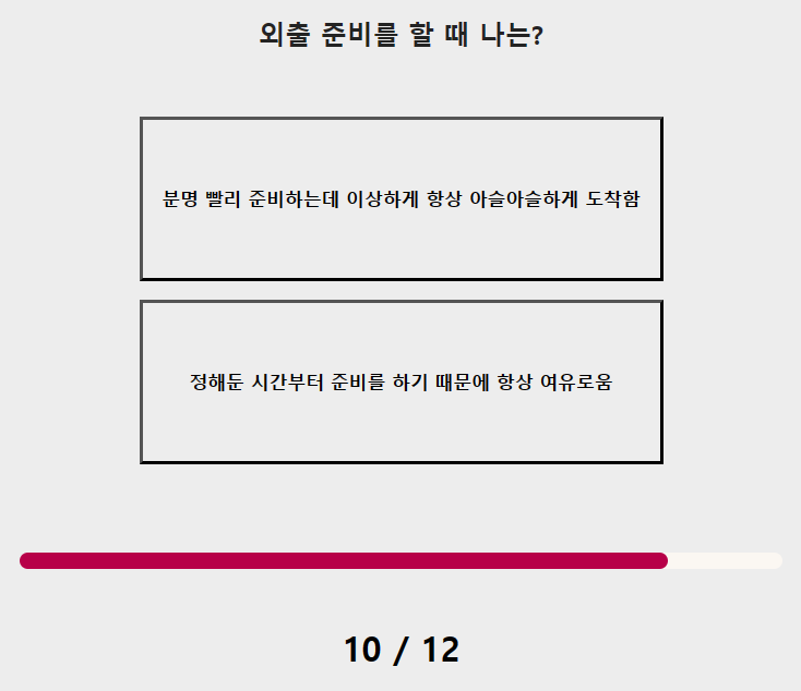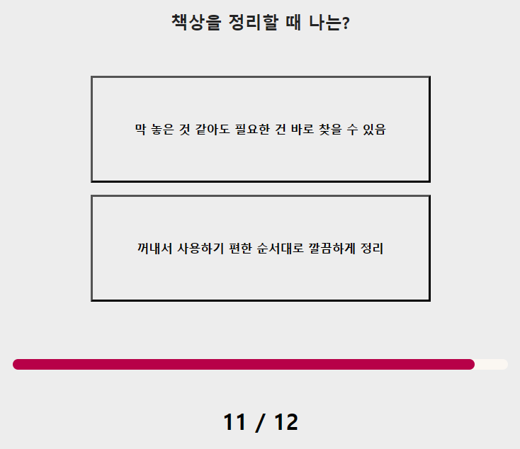이 테스트는 문제와 답이 간단한 형식으로 되어 있어서 자신의 고르고 싶으신 것을 하나 선택하셔서 12문제를 테스트하시면 됩니다.