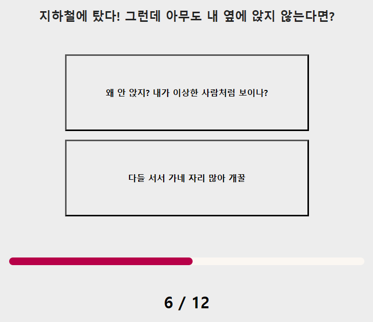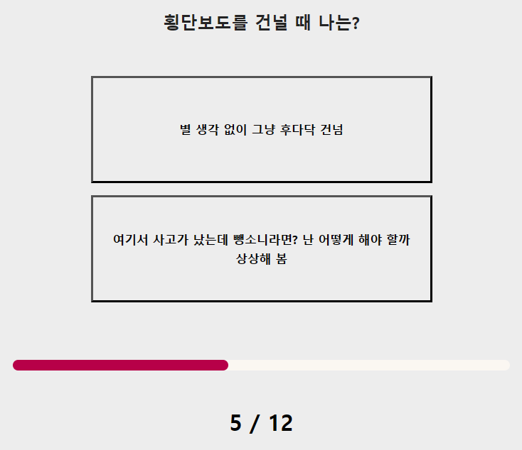5. 횡단보도를 건널 때 나는? 6. 지하철에 탔다! 그런데 아무도 내 옆에 앉지 않는다면?